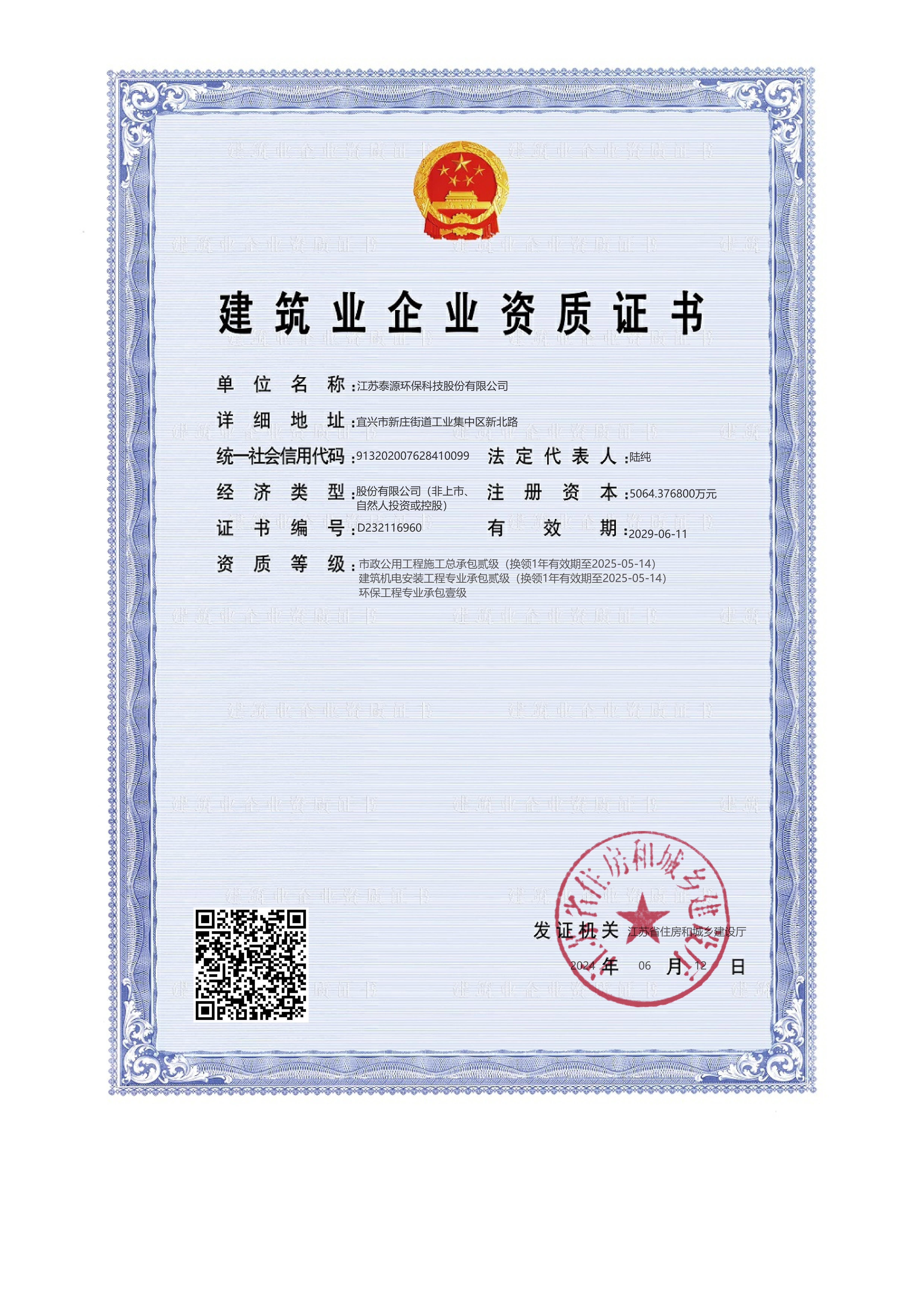 • 环保工程专业承包壹级 市政公用工程施工总承包贰级 建筑机电安装工程专业承包贰级