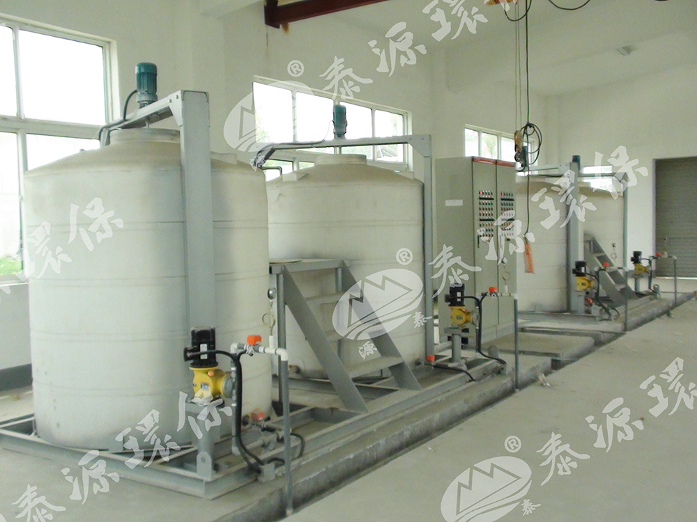 TPY系列加药设备配有一个玻璃钢材质的药剂溶解槽,并配有一套电动搅拌机,二个药剂溶液箱,一套投药装置及配管、钢制平台、扶梯等组成一个整体。