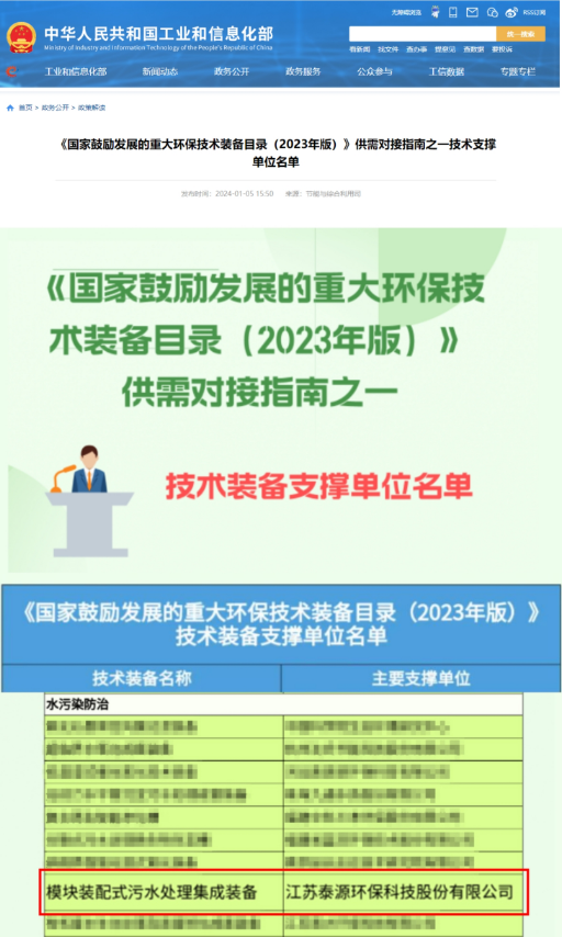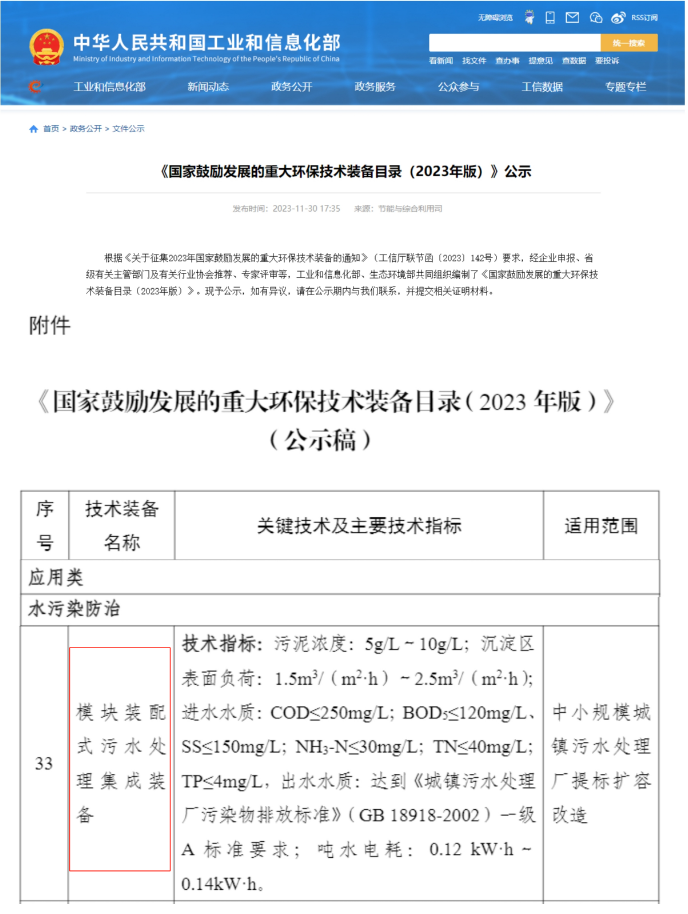 近日,由国家工业和信息化部、生态环境部共同组织编制的《国家鼓励发展的重大环保技术装备目录(2023年版)》正式公告。同时,为更好发挥《目录》引导作用,搭建装备制造企业与需求用户的有效对接渠道,工业和信息化部组织编制了《目录》的供需对接指南,ok138太阳集团(以下简称ok138太阳集团)入选为装备目录中“模块装配式污水处理集成装备”的主要支撑单位。
