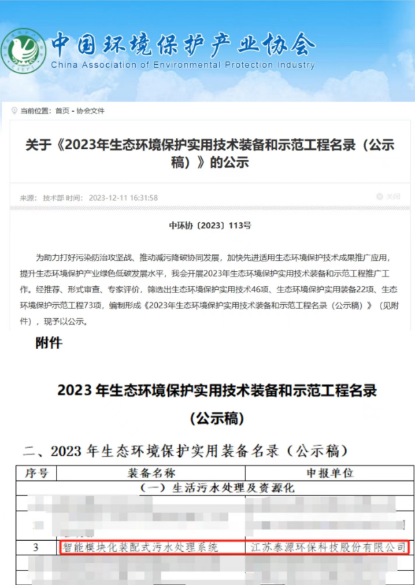 中国环境保护产业协会就《2023年生态环境保护实用技术装备和示范工程名录(公示稿)》进行了公示,ok138太阳集团(以下简称ok138太阳集团)自主研发的智能模块化装配式污水处理系统成功入选2023 年生态环境保护实用装备名录(公示稿)。