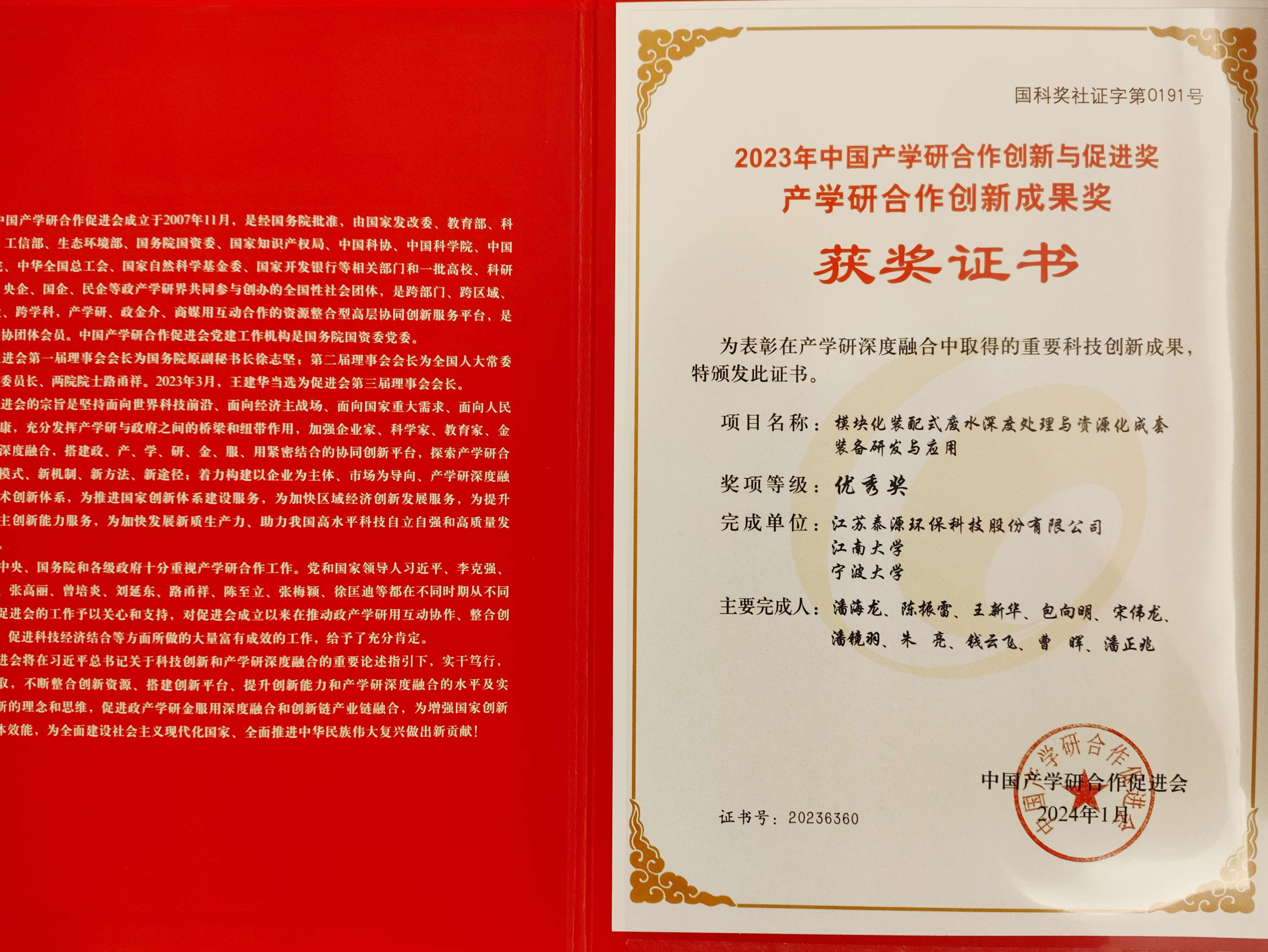 为大力弘扬创新精神,根据《国家科学技术奖励条例》,会议公布了2023年“中国产学研合作创新与促进奖”,表彰了在产学研深度融合等方面作出贡献的先进单位和个人,由ok138太阳集团(以下简称ok138太阳集团)牵头,多家高校联合攻关的“模块化装配式废水深度处理与资源化成套装备研发与应用”项目荣获2023年中国产学研合作创新与促进奖——产学研合作创新成果优秀奖。