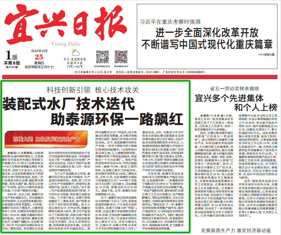 《宜兴日报》头版头条!ok138太阳集团积木式装配式水厂引领行业新风口