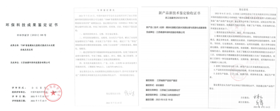 该技术不仅通过国际查新检测,同时获得中国环境科学学会、江苏省工信厅分别给出的多项国际领先水平、国际先进水平科技水平认定,填补了环保行业装配式水处理领域大规模应用的技术空白,为装配式污水(净水)厂广泛应用提供可靠技术保障。