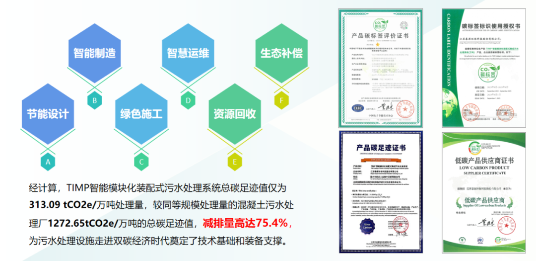 我司始终致力于装配式水厂关键技术的自主研发,综合技术处于国际领先水平,总碳足迹值仅为 313.09 tCO2e/万吨处理量,较同等规模处理量的混凝土污水处理厂1272.65tCO2e/万吨的总碳足迹值,减排量高达75.4%,这为污水处理设施走进双碳经济时代奠定了技术基础和装备支撑。