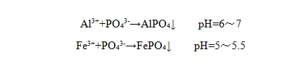 化学除磷是通过“微絮凝过滤”来完成的。通过向污水中投加无机金属盐药剂与污水中溶解性的盐类,与磷酸盐混合后,形成颗粒状、非溶解性的物质,反应方程举例如下式。