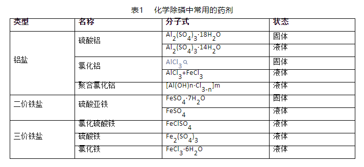 为了生成非溶解性的磷酸盐化合物,用于化学除磷的化学药剂主要是金属盐药剂和氢氧化钙。许多高价金属离子药剂投加到污水中后都会与污水中的溶解性磷离子结合生成难溶解性的化合物,但出于经济原因考虑,用于磷沉析的金属盐药剂主要是Fe3+盐、Fe2+盐和Al3+盐,这些药剂是以溶液和悬浮液状态使用的。