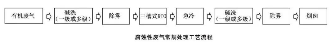 (1) 处理工艺流程。对于腐蚀性有机废气,常规处理工艺流程。有机废气先经过预处理碱洗,吸收大部分无机酸性组分,然后进一步除雾除水,再进入RTO氧化分解,有机酸性组分产生SO₂, HC1等酸性气体,再经过急冷塔降温,进入后处理碱洗塔吸收酸性气体,达标后经除雾除水从烟囱排放。根据酸性组分与浓度等废气特点不同,预处理碱洗和后处理碱洗可以为一级或多级,还可以为碱洗+水洗相结合的方式。